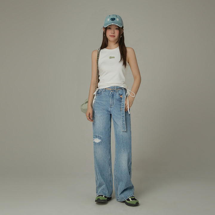 CHUU Heart Belt Waist Slit Ripped Denim Jeans