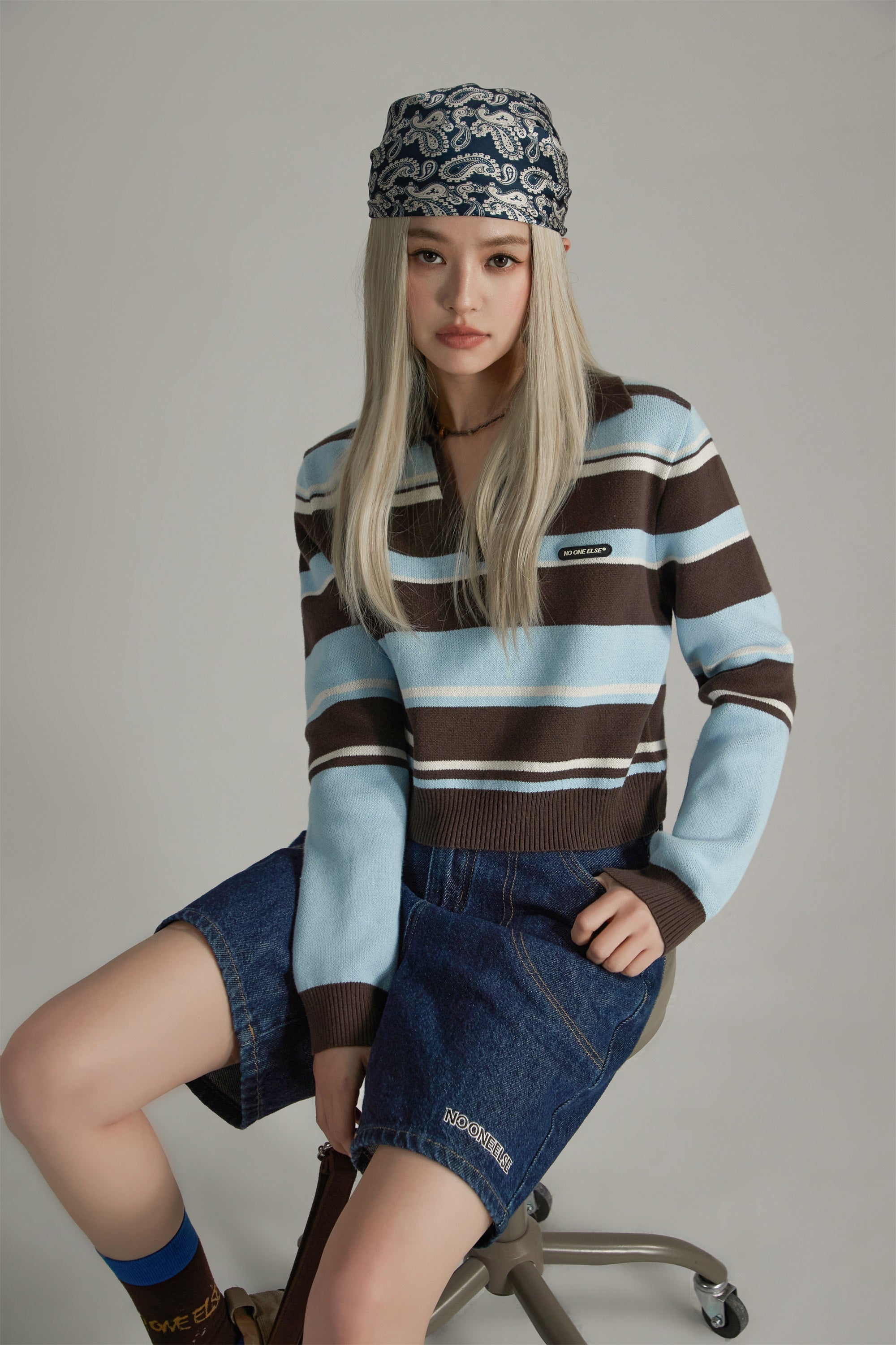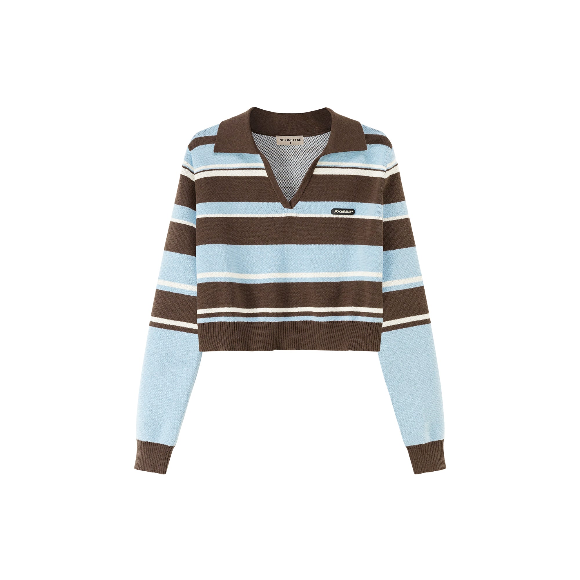 NO ONE ELSE Open Collar Stripe Color Knit Sweater